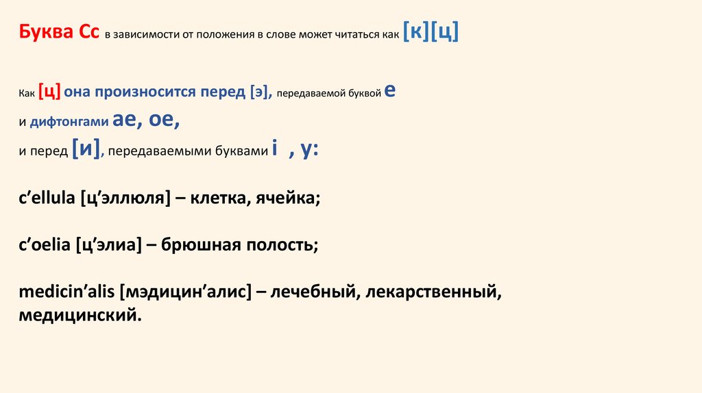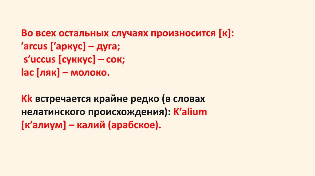 Во всех остальных случаях произносится [к]:′arcus [′аркус] – дуга;