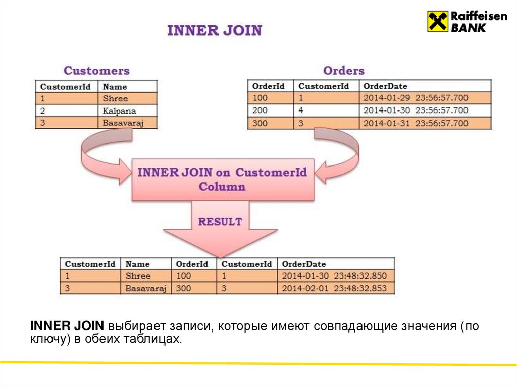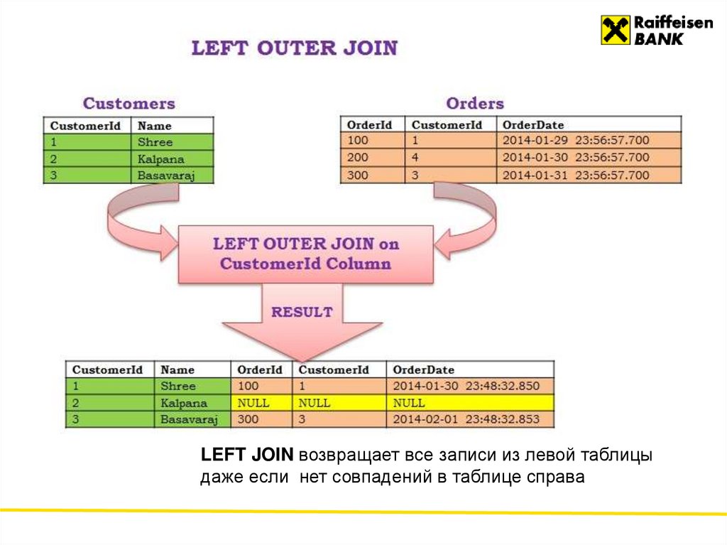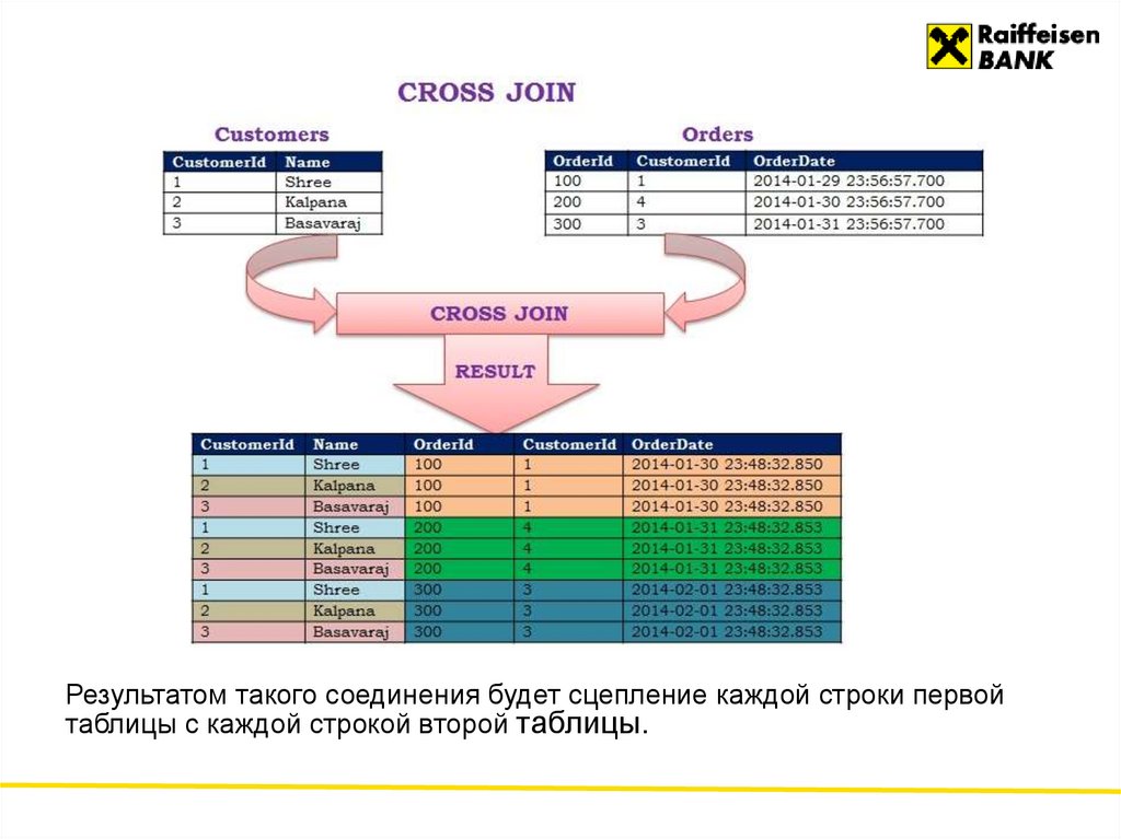 Результатом такого соединения будет сцепление каждой строки первойтаблицы с каждой строкой второй таблицы.