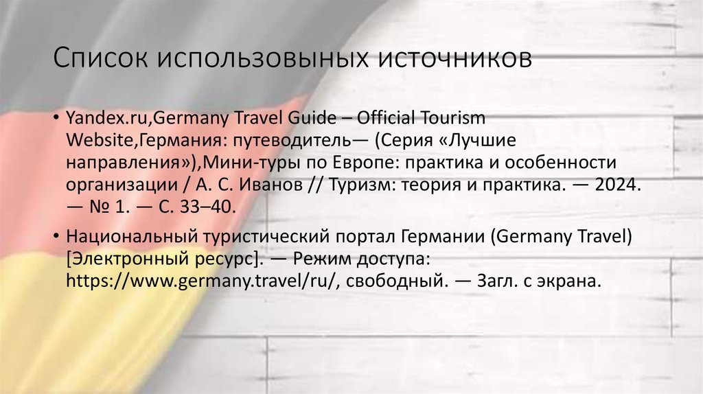 Список использовыных источников• Yandex.ru,Germany Travel Guide – Official Tourism