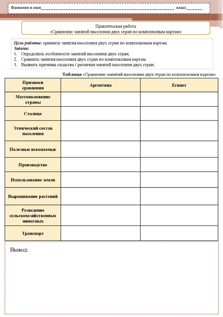 Таблица «Сравнение занятий населения двух стран по комплексным картам»