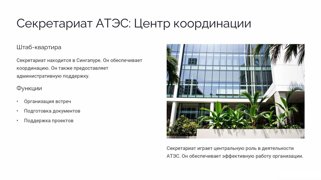 Секретариат находится в Сингапуре. Он обеспечивает