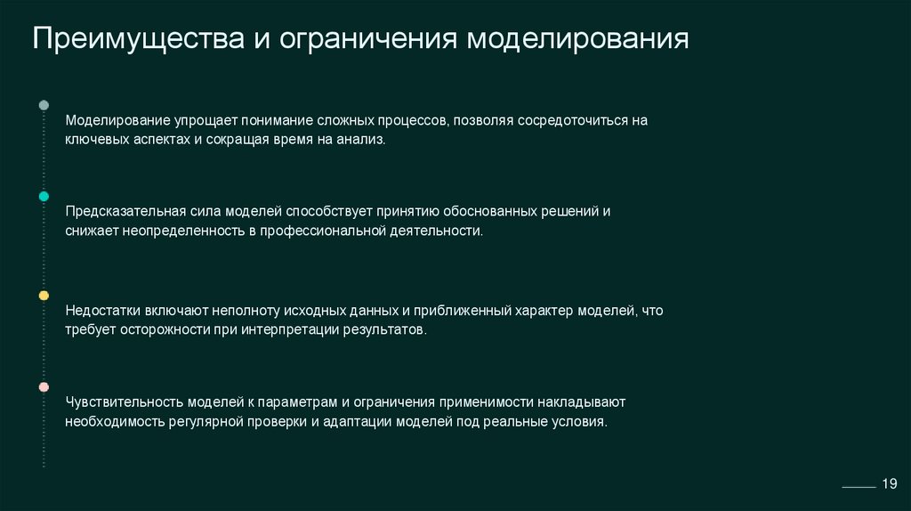 Преимущества и ограничения моделированияМоделирование упрощает понимание сложных процессов, позволяя сосредоточиться на