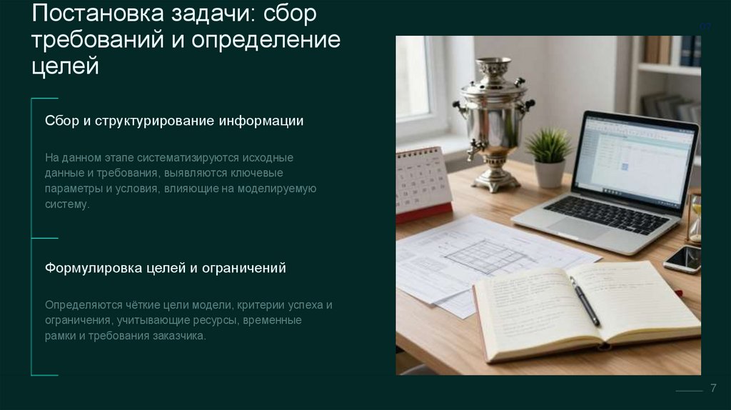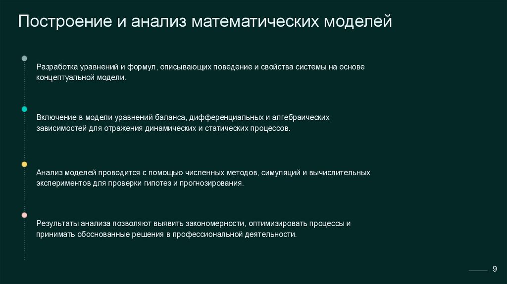 Построение и анализ математических моделейРазработка уравнений и формул, описывающих поведение и свойства системы на основе