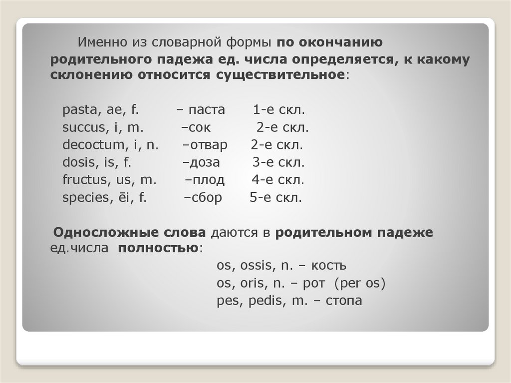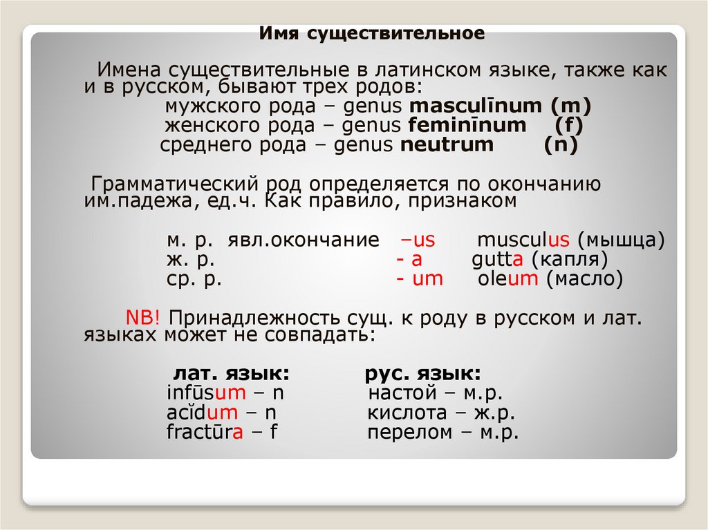 NB! Принадлежность сущ. к роду в русском и лат.