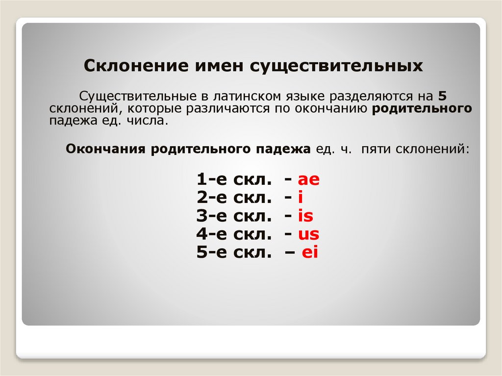 Склонение имен существительныхСуществительные в латинском языке разделяются на 5