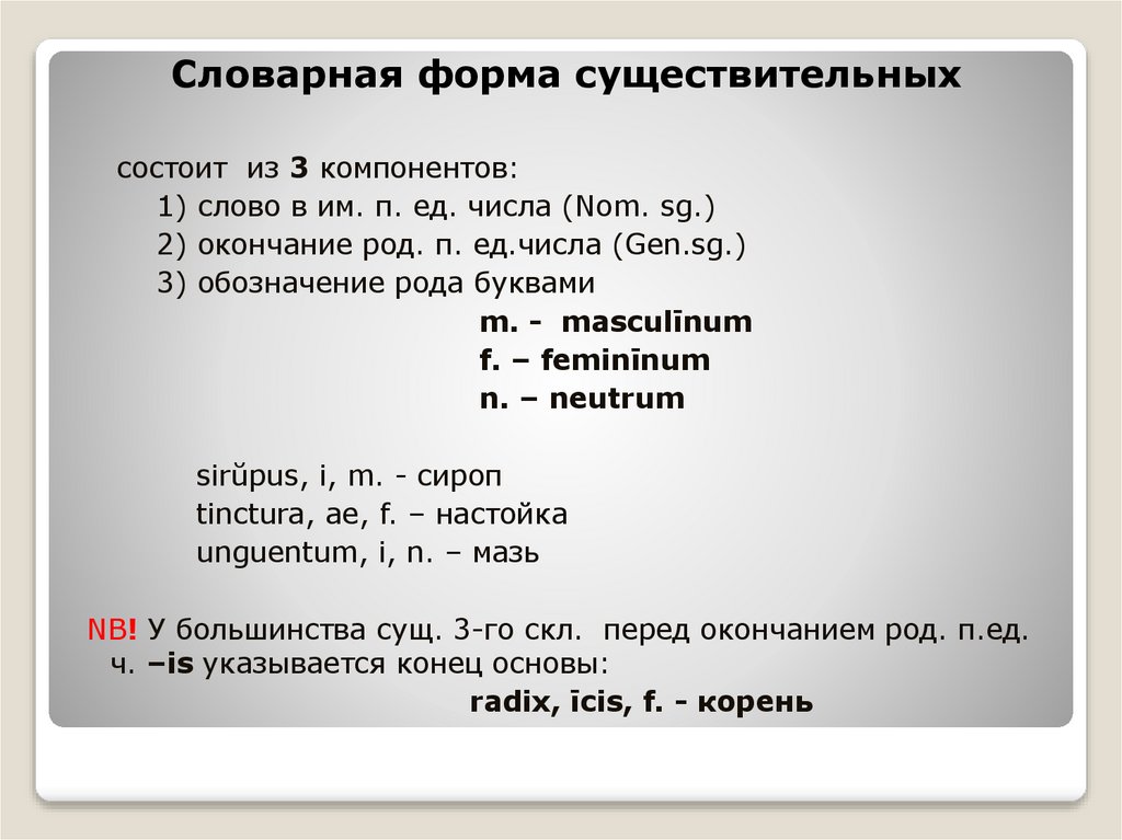 Словарная форма существительныхсостоит из 3 компонентов: