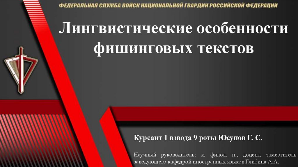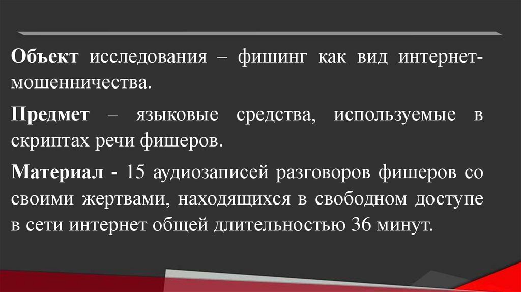 Объект исследования – фишинг как вид интернетмошенничества.Предмет – языковые средства, используемые в