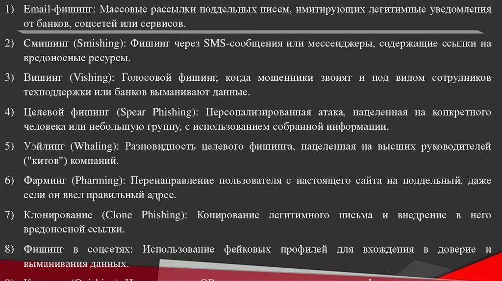1) Email-фишинг: Массовые рассылки поддельных писем, имитирующих легитимные уведомленияот банков, соцсетей или сервисов.