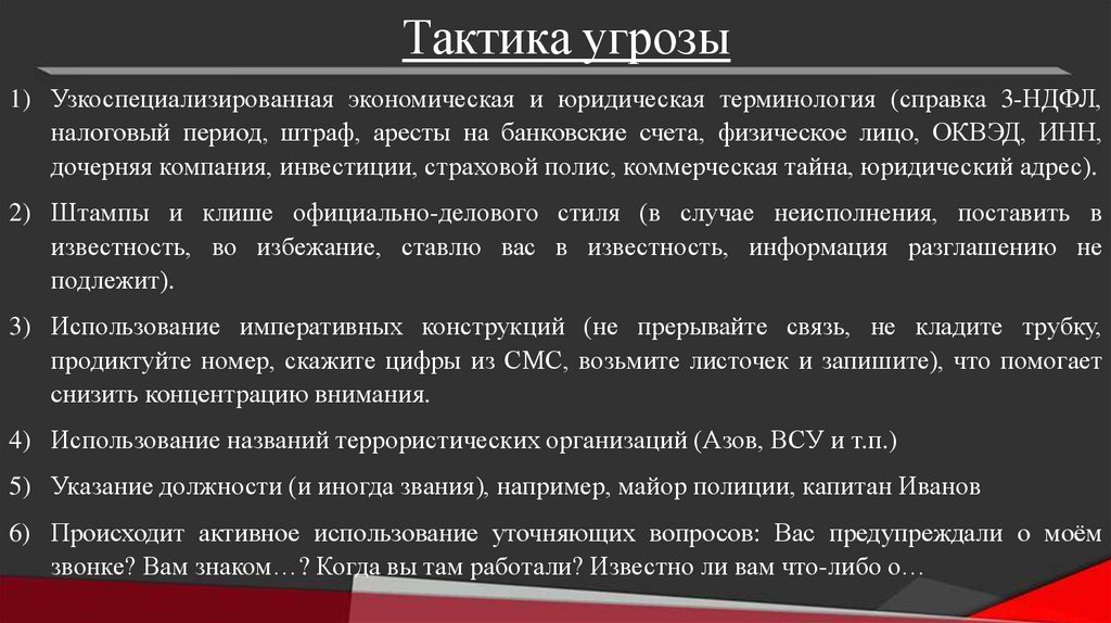 Тактика угрозы1) Узкоспециализированная экономическая и юридическая терминология (справка 3-НДФЛ,