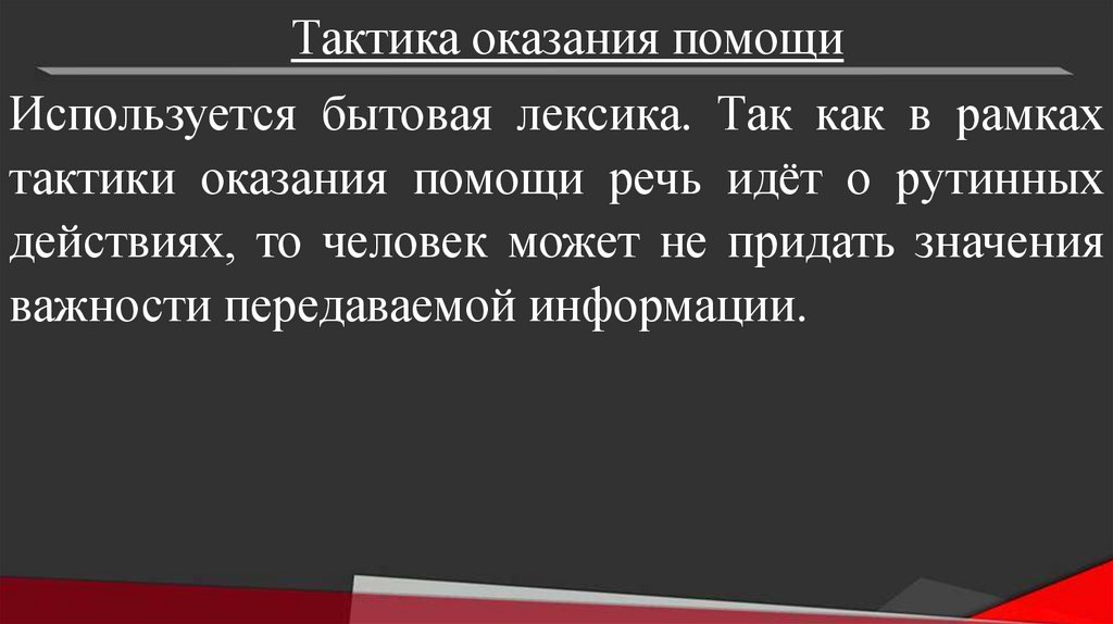 Тактика оказания помощиИспользуется бытовая лексика. Так как в рамках