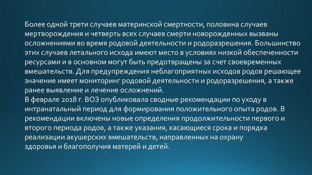 Более одной трети случаев материнской смертности, половина случаевмертворождения и четверть всех случаев смерти новорожденных вызваны