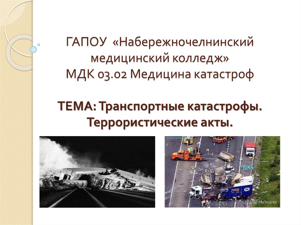 1. ГАПОУ «Набережночелнинский медицинский колледж» МДК 03.02 Медицина катастроф ТЕМА: Транспортные катастрофы. Террористические