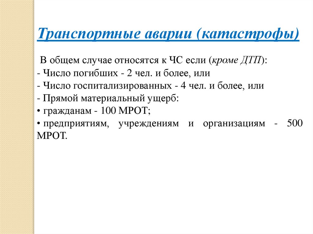 Транспортные аварии (катастрофы)В общем случае относятся к ЧС если (кроме ДТП):