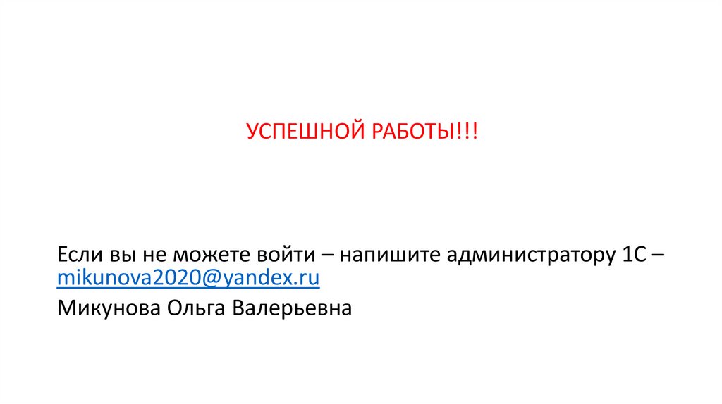УСПЕШНОЙ РАБОТЫ!!!Если вы не можете войти – напишите администратору 1С –