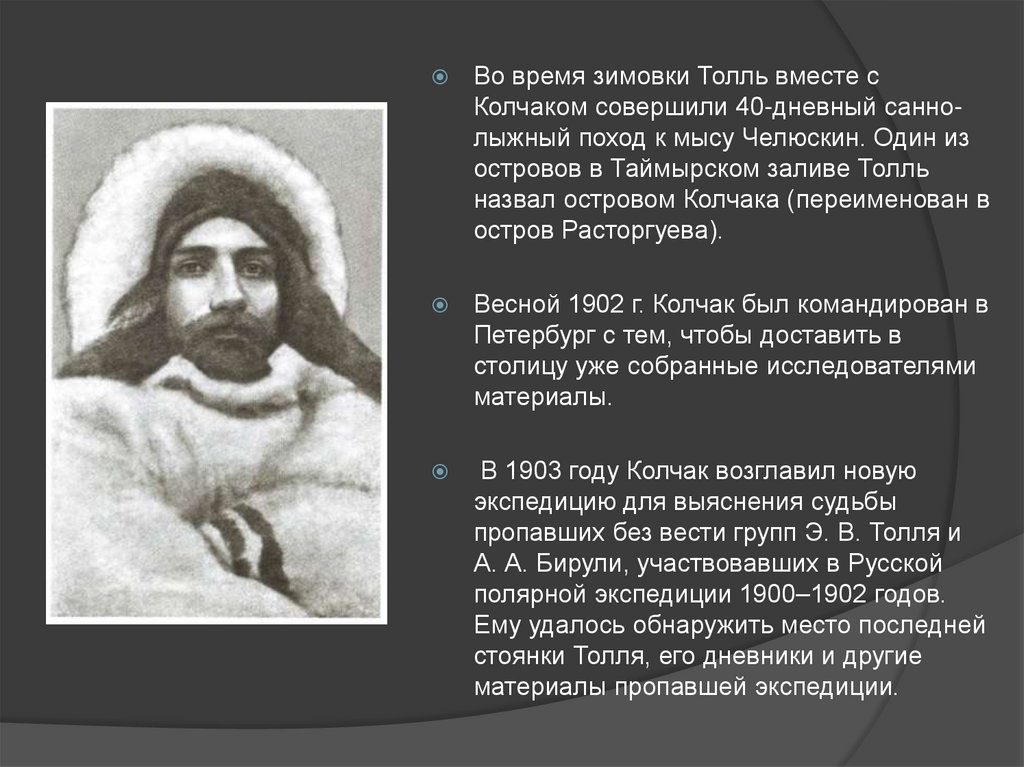 Во время зимовки Толль вместе сКолчаком совершили 40-дневный саннолыжный поход к мысу Челюскин. Один из