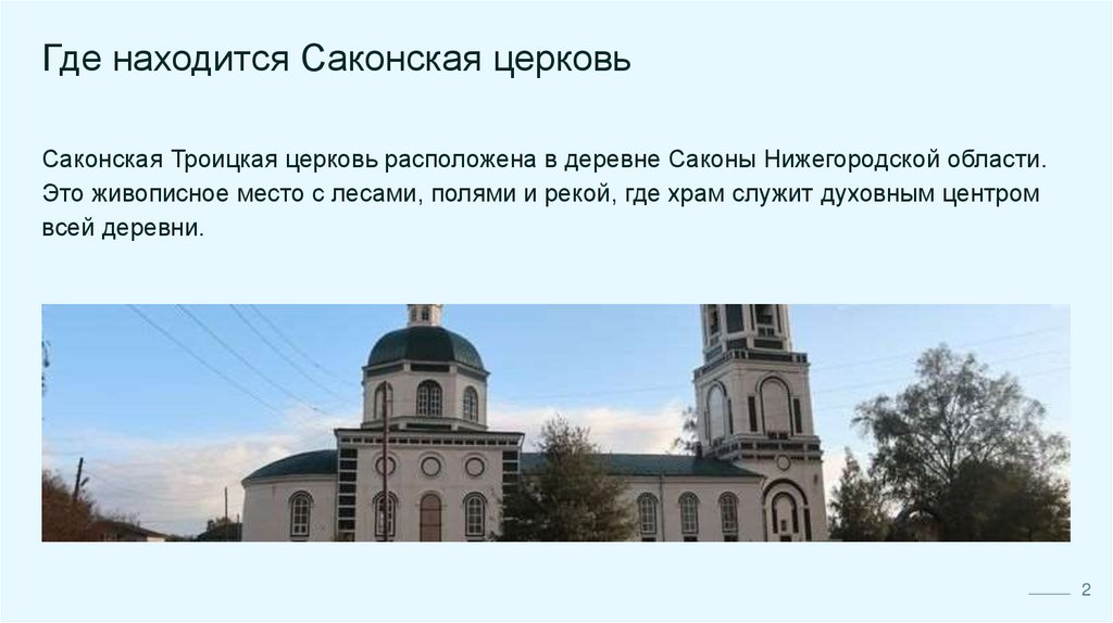 Где находится Саконская церковьСаконская Троицкая церковь расположена в деревне Саконы Нижегородской области.