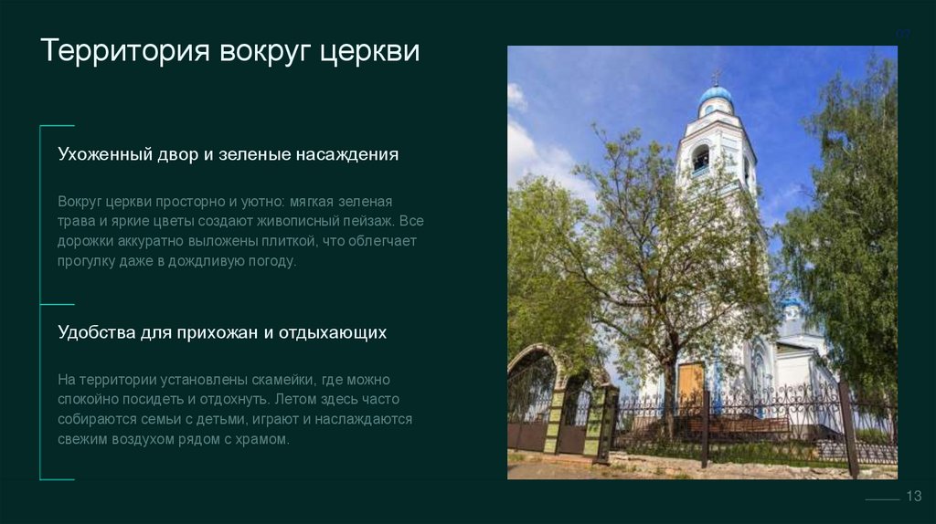 Территория вокруг церквиУхоженный двор и зеленые насаждения