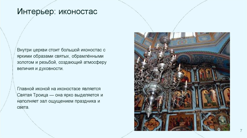 Интерьер: иконостасВнутри церкви стоит большой иконостас с