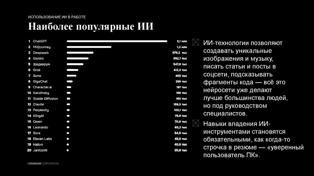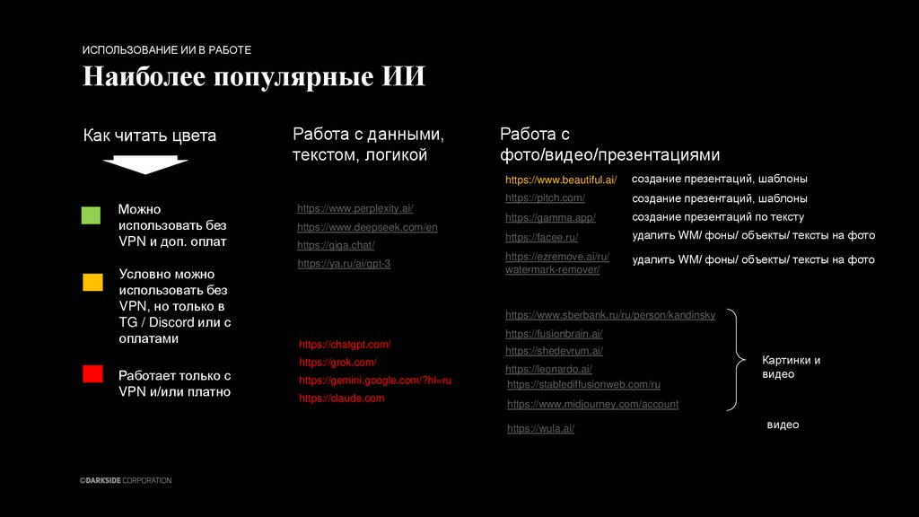 ИСПОЛЬЗОВАНИЕ ИИ В РАБОТЕНаиболее популярные ИИ