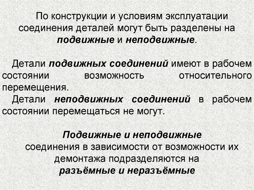 По конструкции и условиям эксплуатациисоединения деталей могут быть разделены на