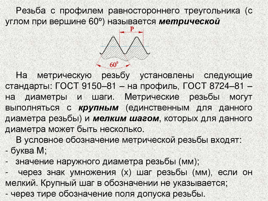 Резьба с профилем равностороннего треугольника (суглом при вершине 60º) называется метрической