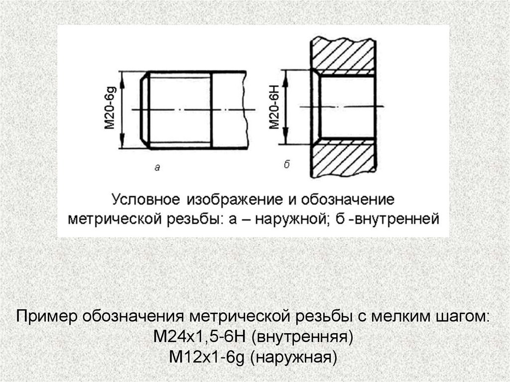 Пример обозначения метрической резьбы с мелким шагом:М24х1,5-6Н (внутренняя)