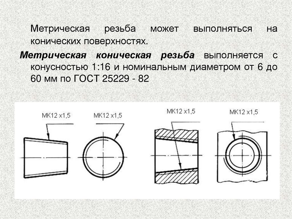 Метрическая резьба может выполняться наконических поверхностях.