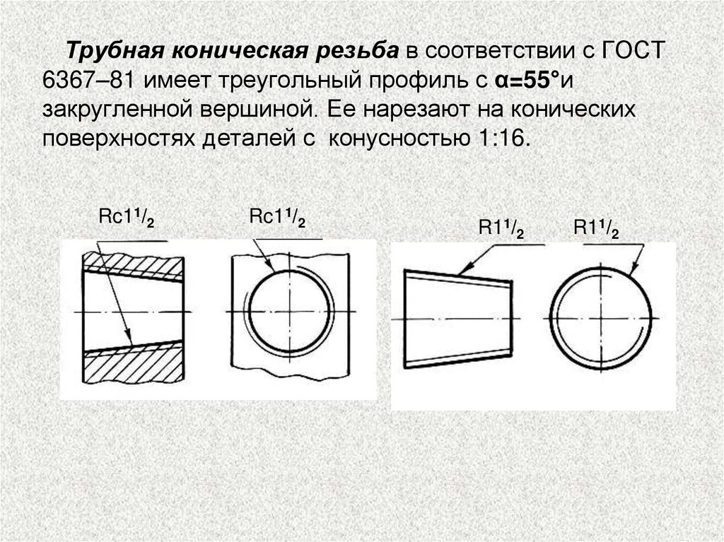 Трубная коническая резьба в соответствии с ГОСТ6367–81 имеет треугольный профиль с α=55°и