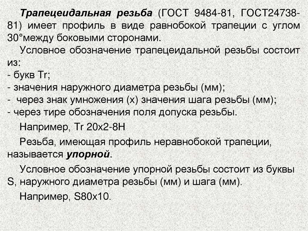 Трапецеидальная резьба (ГОСТ 9484-81, ГОСТ2473881) имеет профиль в виде равнобокой трапеции с углом30°между боковыми сторонами.