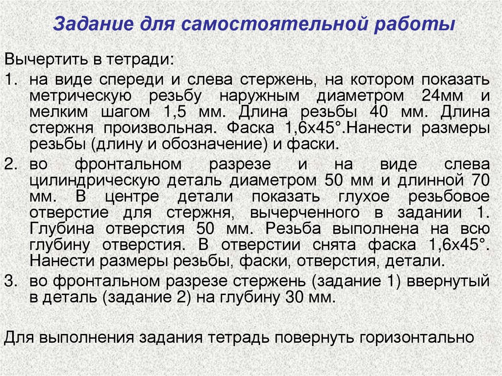 Нанести размеры резьбы, фаски, отверстия, детали.