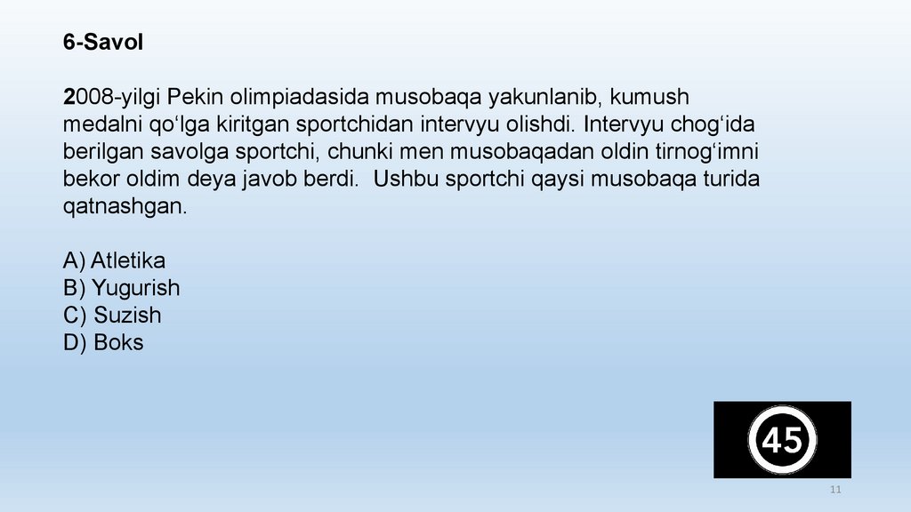 6-Savol2008-yilgi Pekin olimpiadasida musobaqa yakunlanib, kumush