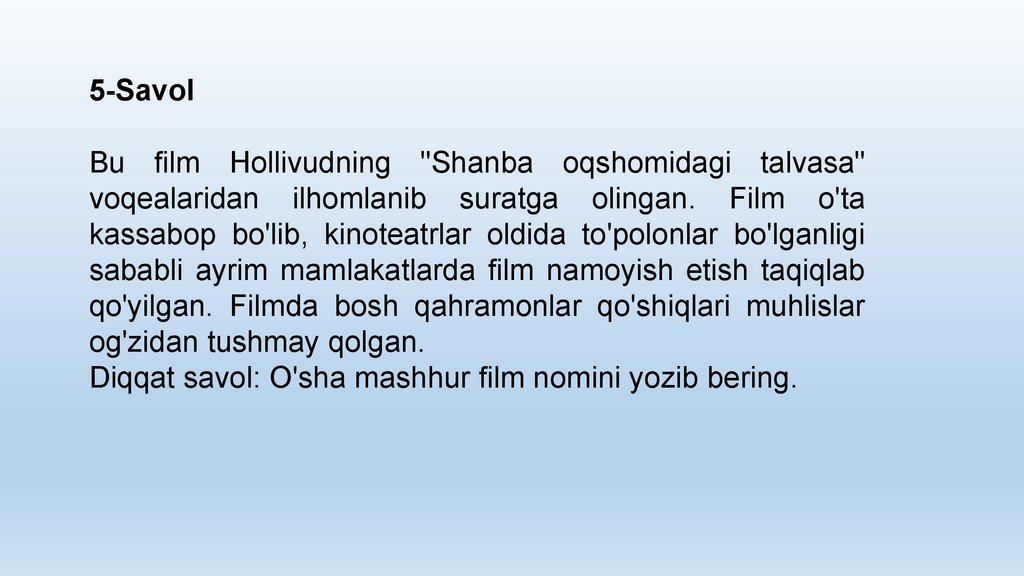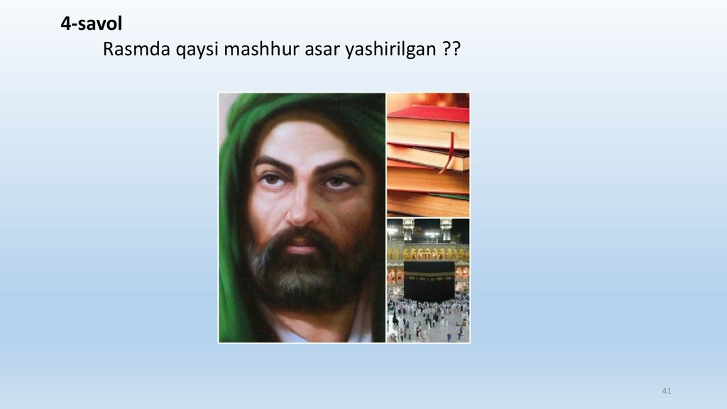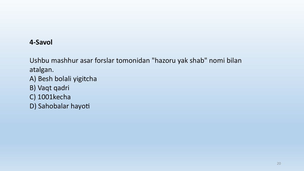 4-savolUshbu mashhur asar forslar tomonidan "Hazoru yak shab"