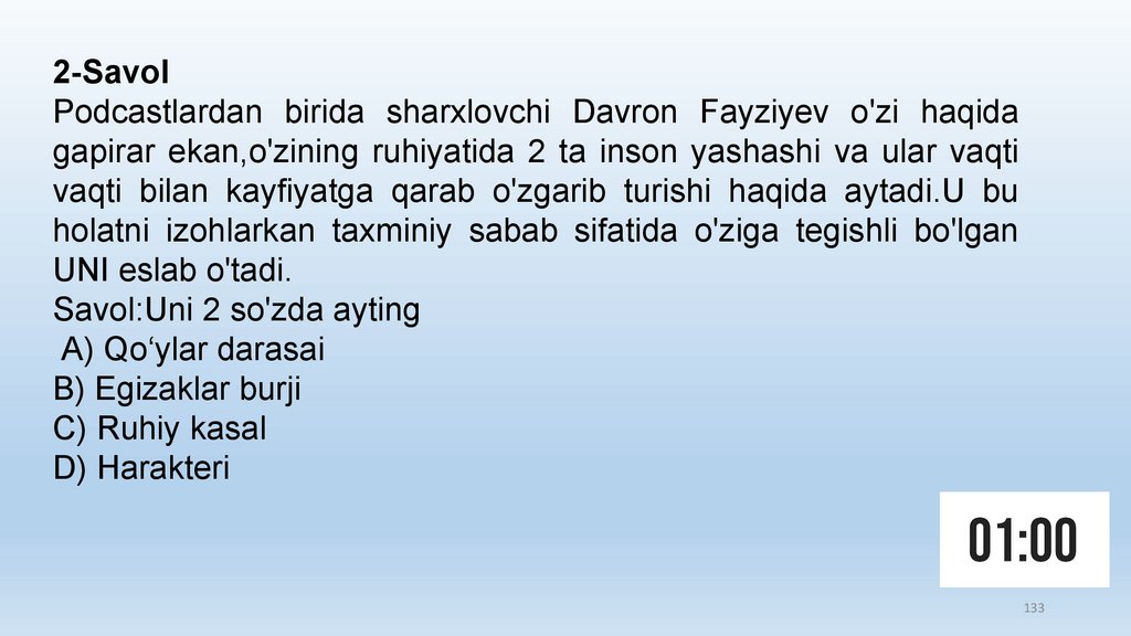 2-SavolPodcastlardan birida sharxlovchi Davron Fayziyev o'zi haqida gapirar
