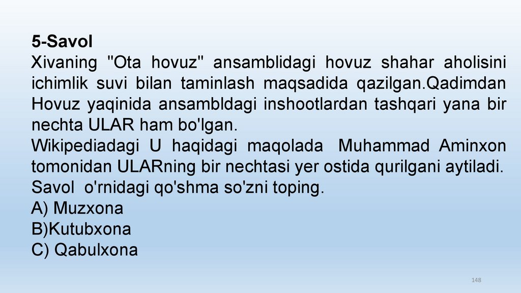 5-SavolXivaning "Ota hovuz" ansamblidagi hovuz shahar aholisini