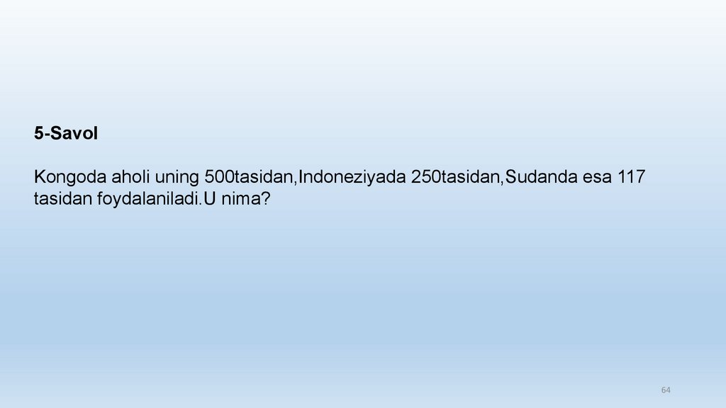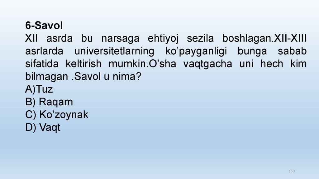 6-SavolXII asrda bu narsaga ehtiyoj sezila boshlagan.XIIXIII asrlarda universitetlarning ko’payganligi bunga
