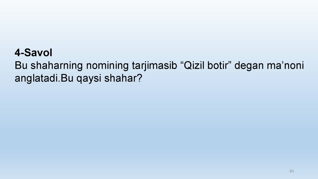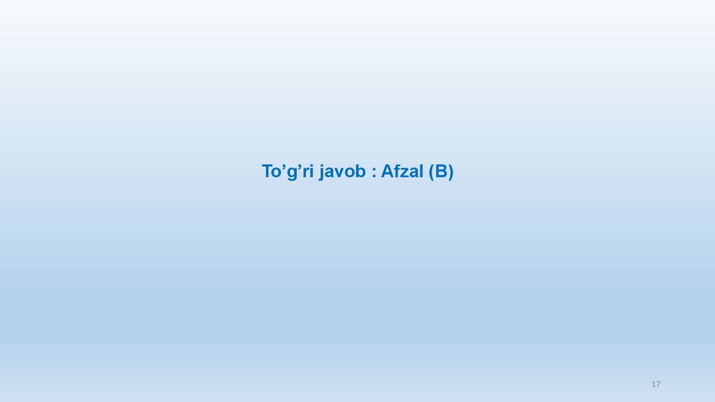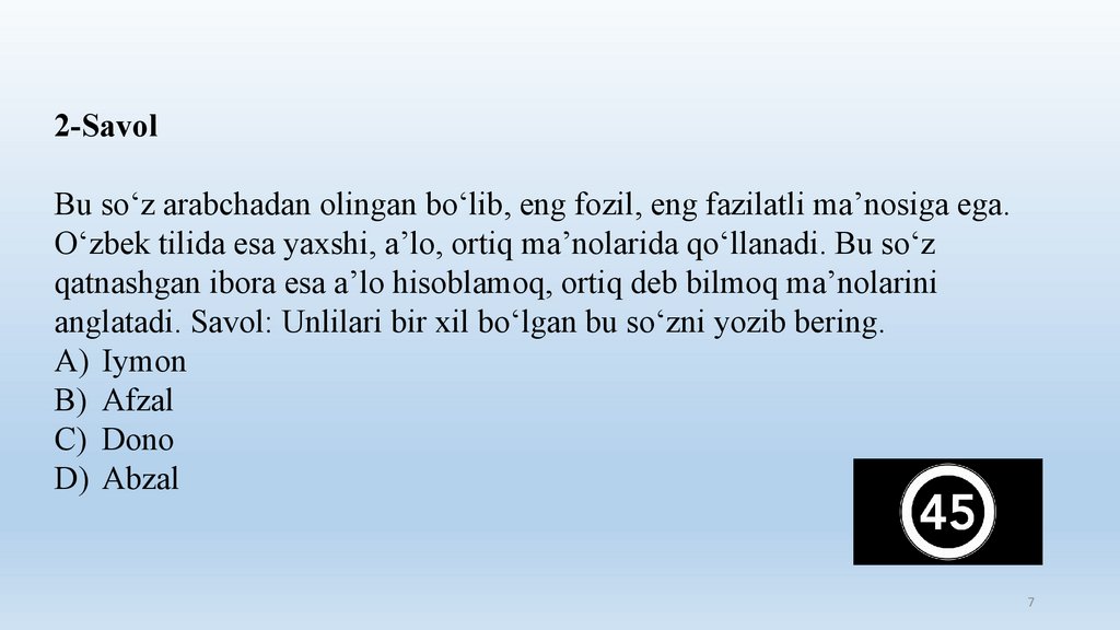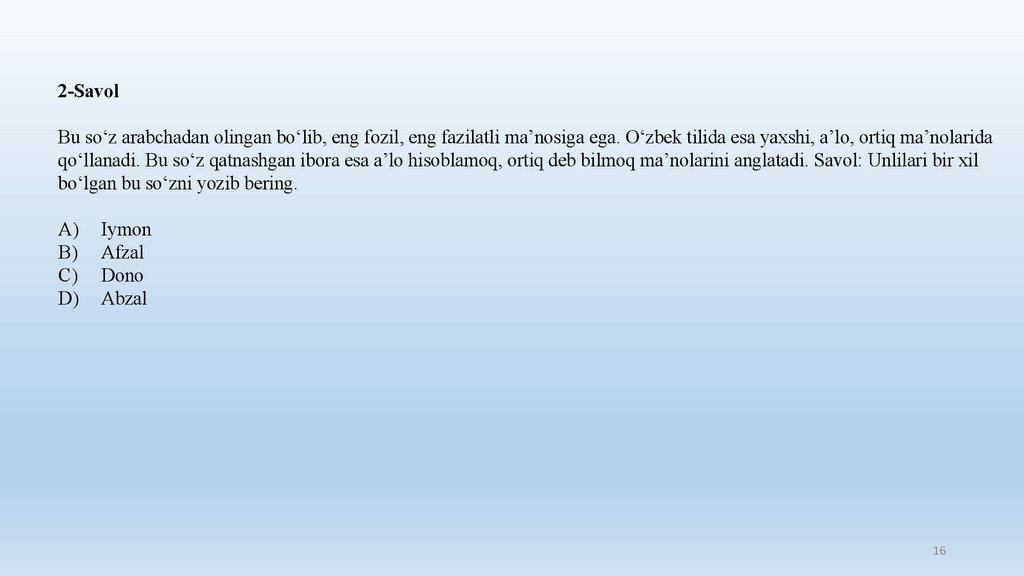 2-SavolBu soʻz arabchadan olingan boʻlib, eng fozil, eng fazilatli ma’nosiga ega. O‘zbek tilida esa yaxshi, a’lo, ortiq ma’nolarida