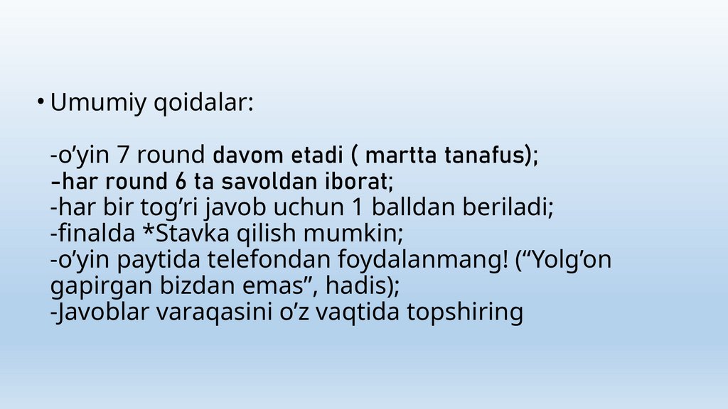 • Umumiy qoidalar:-o’yin 7 round davom etadi ( martta tanafus);