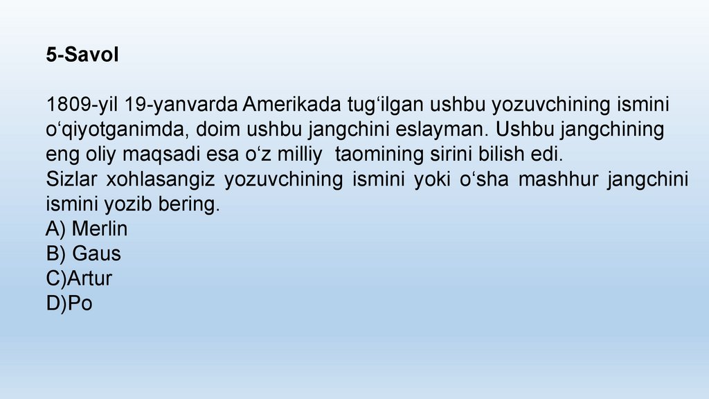 5-Savol1809-yil 19-yanvarda Amerikada tugʻilgan ushbu yozuvchining