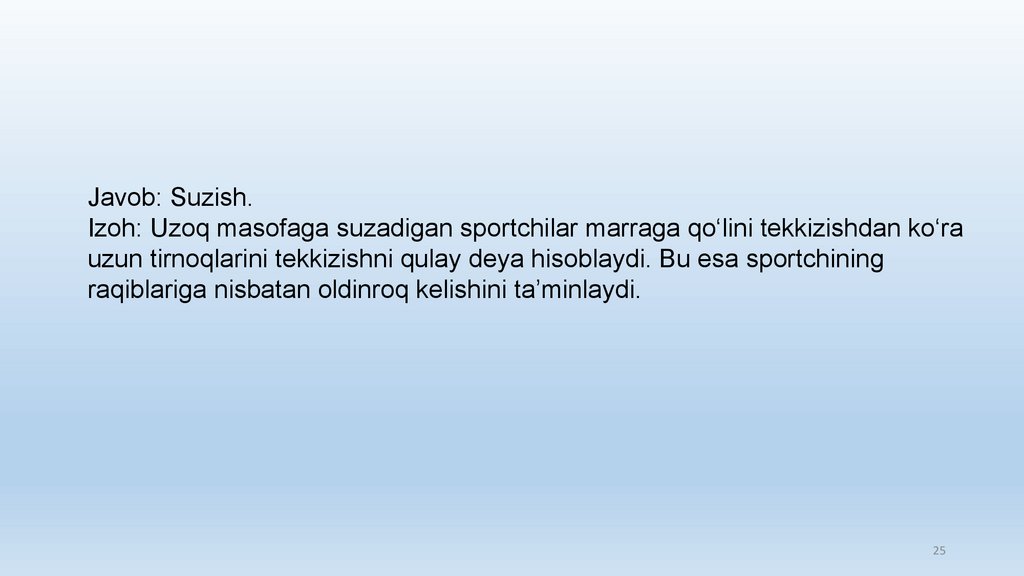berilgan savolga sportchi, chunki men musobaqadan oldin tirnogʻimni