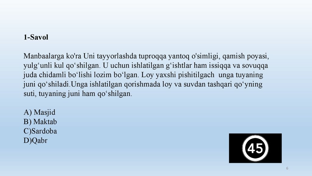 1-SavolManbaalarga ko’ra Uni tayyorlashda tuproqqa yantoq o'simligi, qamish poyasi, yulg’unli