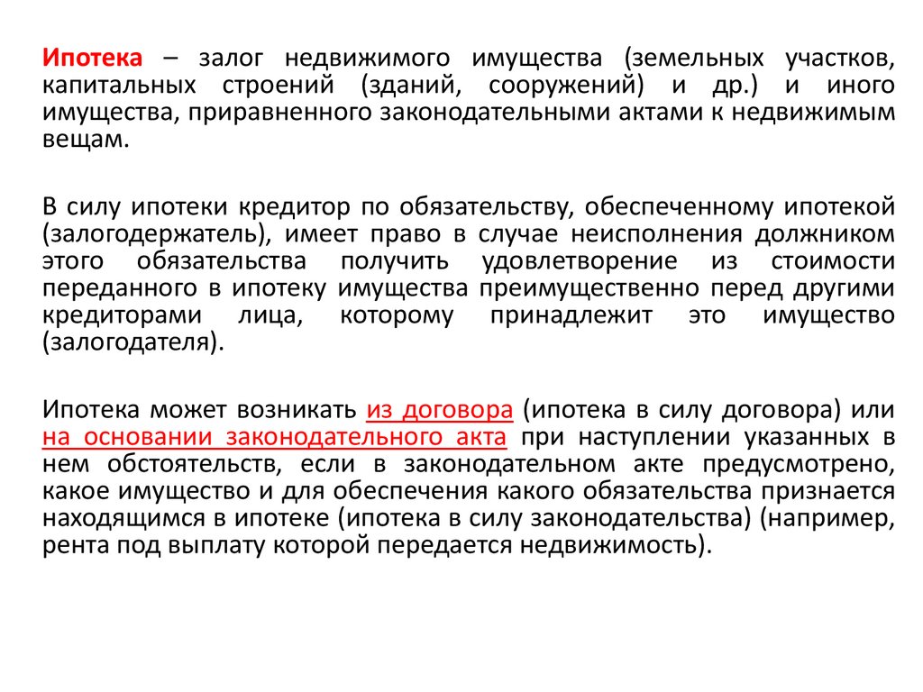 Ипотека – залог недвижимого имущества (земельных участков,капитальных строений (зданий, сооружений) и др.) и иного