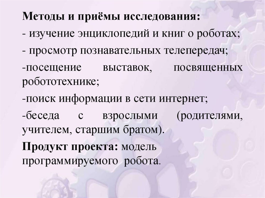 Методы и приёмы исследования:- изучение энциклопедий и книг о роботах;