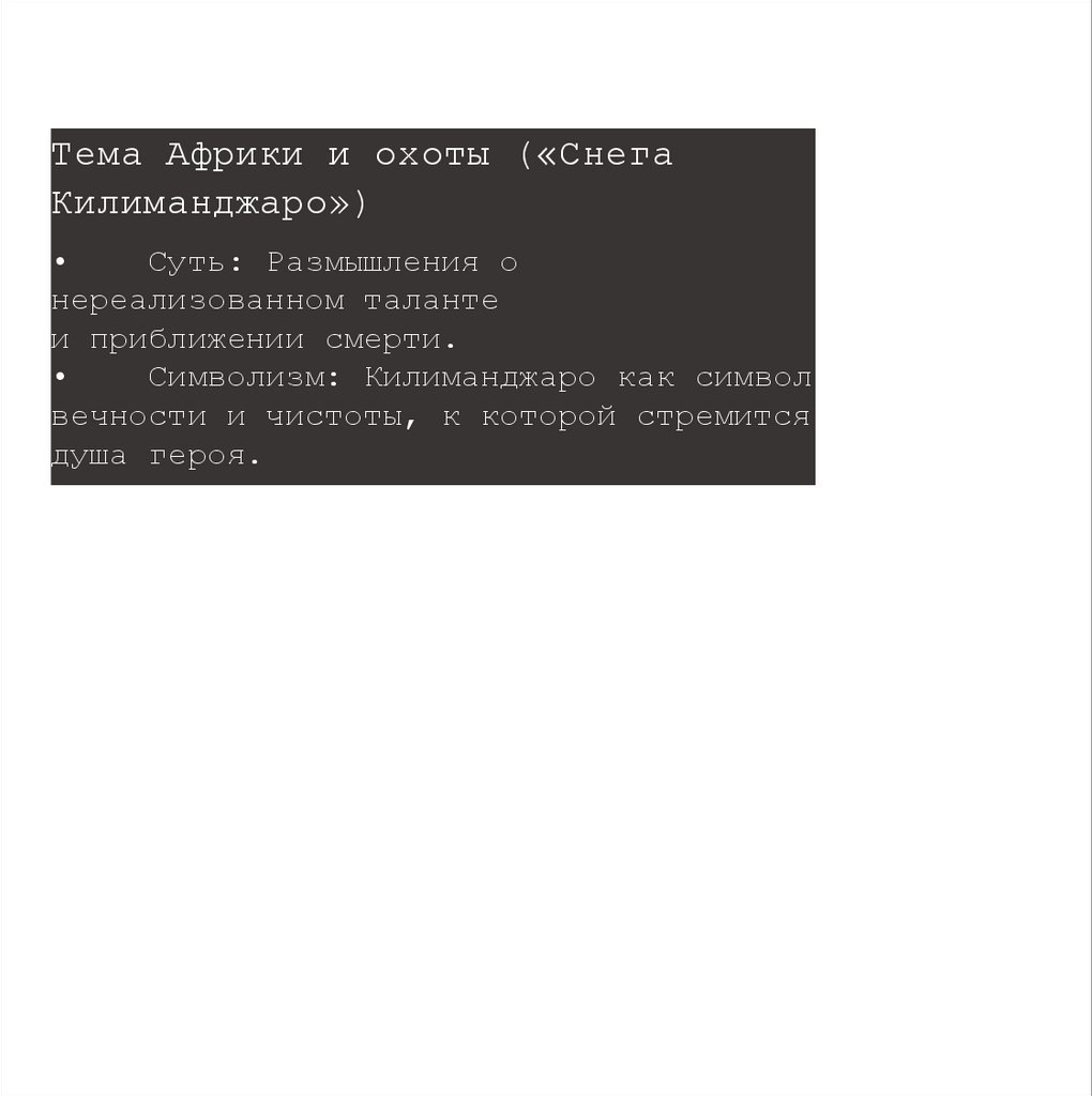 Тема Африки и охоты («СнегаКилиманджаро»)