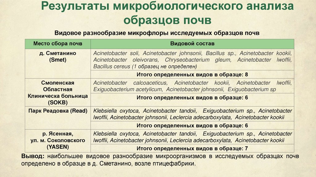Вывод: наибольшее видовое разнообразие микроорганизмов в исследуемых образцах почв