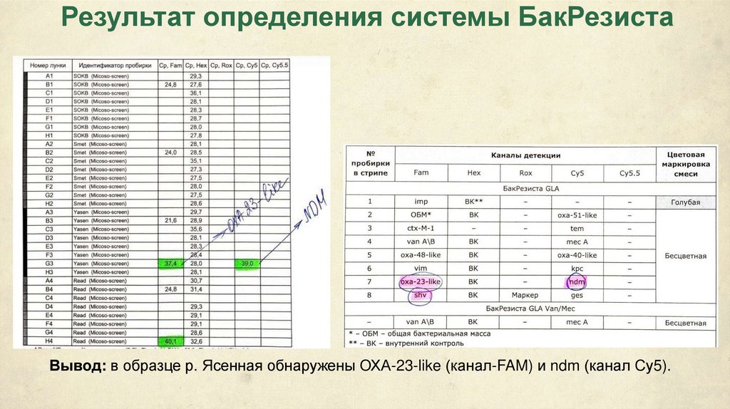 Результат определения системы БакРезистаВывод: в образце р. Ясенная обнаружены ОХА-23-like (канал-FAM) и ndm (канал Су5).