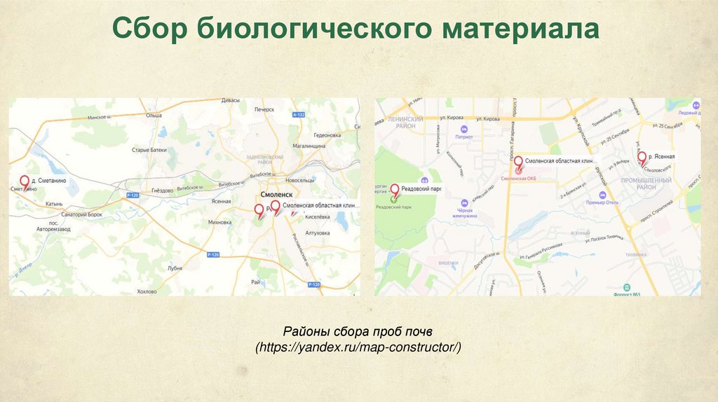 1. Отбор проб почв в разных частях города Смоленска для исследования.