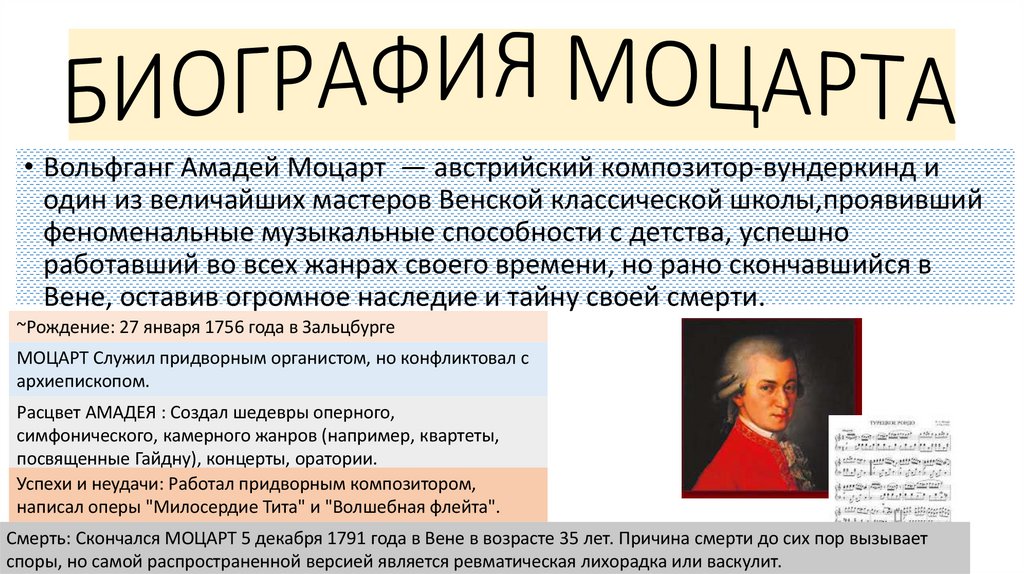 • Вольфганг Амадей Моцарт — австрийский композитор-вундеркинд иодин из величайших мастеров Венской классической школы,проявивший