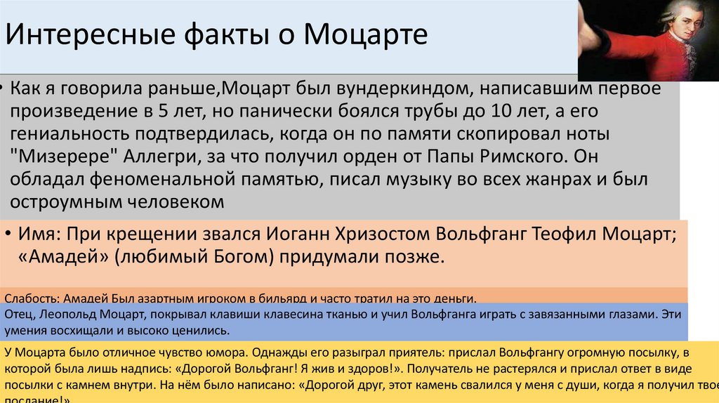 Интересные факты о Моцарте• Как я говорила раньше,Моцарт был вундеркиндом, написавшим первое