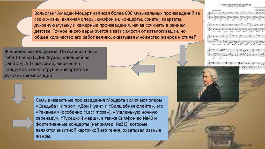 Вольфганг Амадей Моцарт написал более 600 музыкальных произведений засвою жизнь, включая оперы, симфонии, концерты, сонаты, квартеты,