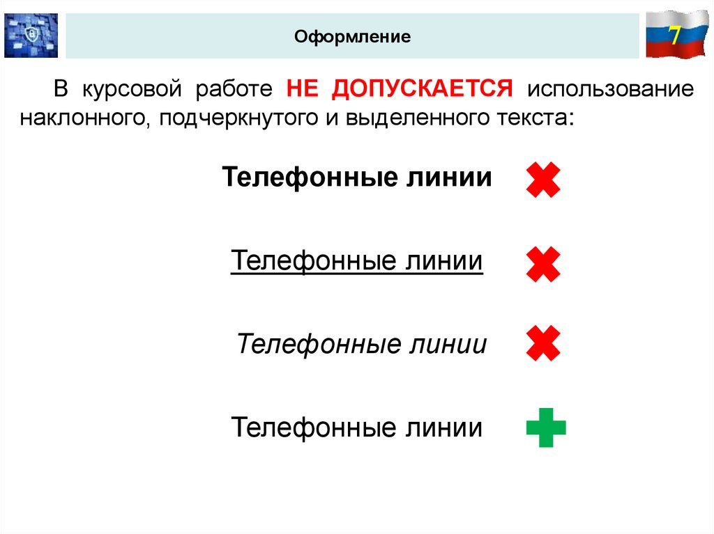 наклонного, подчеркнутого и выделенного текста: